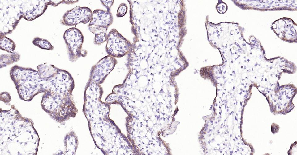 Paraformaldehyde-fixed, paraffin embedded Human Placenta; Antigen retrieval by boiling in sodium citrate buffer (pH6.0) for 15 min; Antibody incubation with LRP2 Monoclonal Antibody, Unconjugated(bsm-42103R) at 1:200 overnight at 4°C, followed by conjugation to the SP Kit (Rabbit, SP-0023)and DAB (C-0010) staining.
