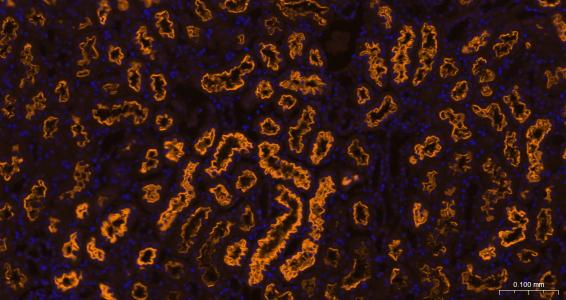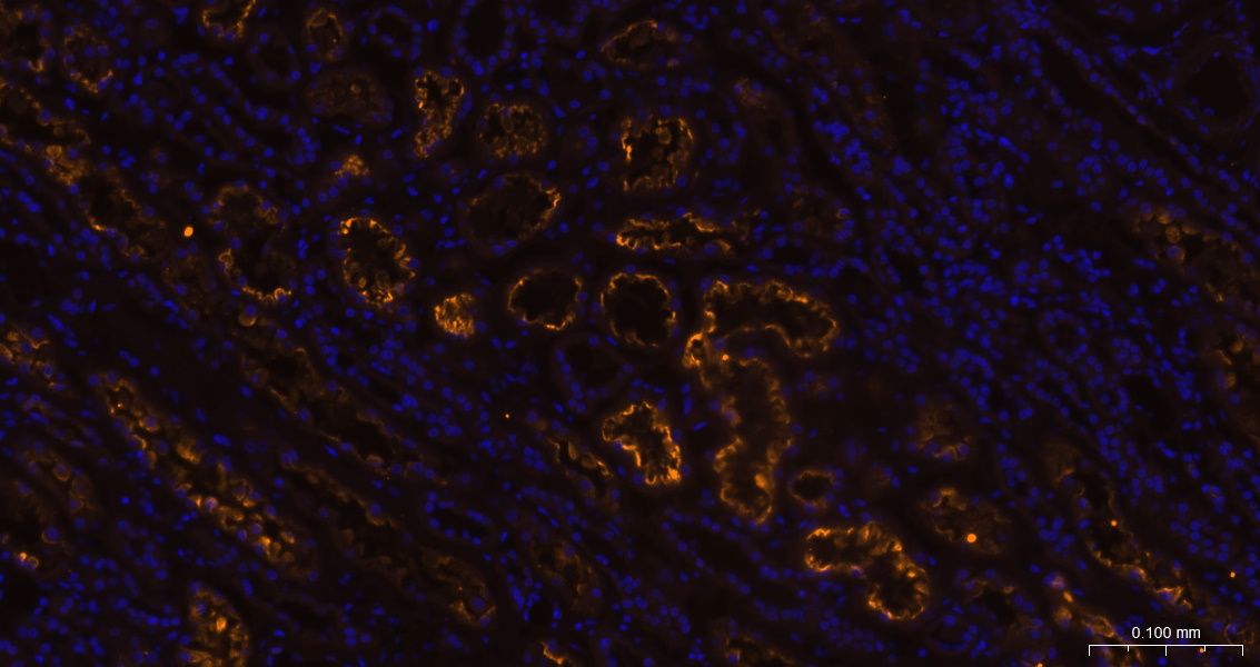 Paraformaldehyde-fixed, paraffin embedded Human kidney; Antigen retrieval by boiling in sodium citrate buffer (pH6.0) for 15min; Blocking buffer (normal goat serum) at 37°C for 30min; Incubation with LRP2 Monoclonal Antibody, Unconjugated (bsm-42103R) at 1:200 overnight at 4°C, followed by a Cy3 conjugated Goat Anti-Rabbit IgG antibody (bs-0295G-Cy3) for 90 minutes, and DAPI for nuclei staining.