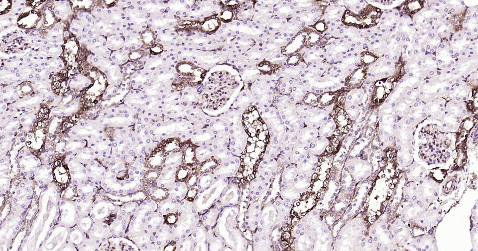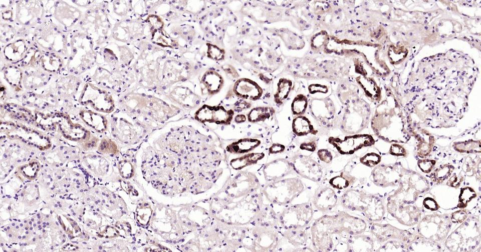 Paraformaldehyde-fixed, paraffin embedded Mouse Kidney; Antigen retrieval by boiling in sodium citrate buffer (pH6.0) for 15 min; Antibody incubation with IKB alpha Monoclonal Antibody, Unconjugated(bsm-56204R) at 1:200 overnight at 4°C, followed by conjugation to the bs-0295G-HRP and DAB (C-0010) staining.