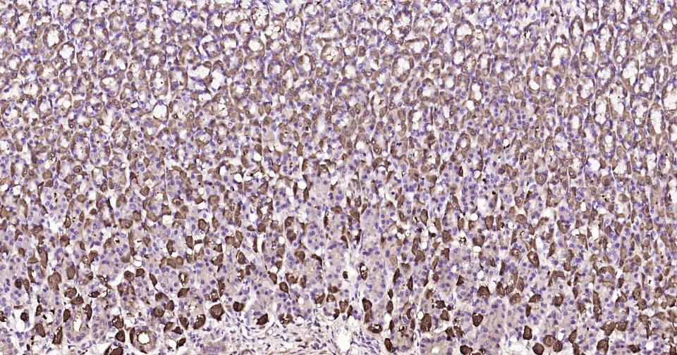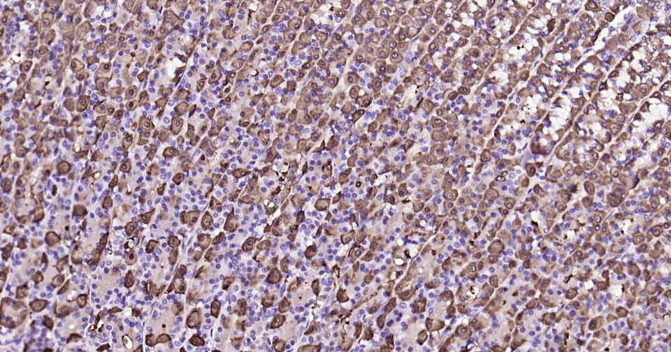 Paraformaldehyde-fixed, paraffin embedded Rat Stomach; Antigen retrieval by boiling in sodium citrate buffer (pH6.0) for 15 min; Antibody incubation with IKB alpha Monoclonal Antibody, Unconjugated(bsm-56204R) at 1:200 overnight at 4°C, followed by conjugation to the bs-0295G-HRP and DAB (C-0010) staining.