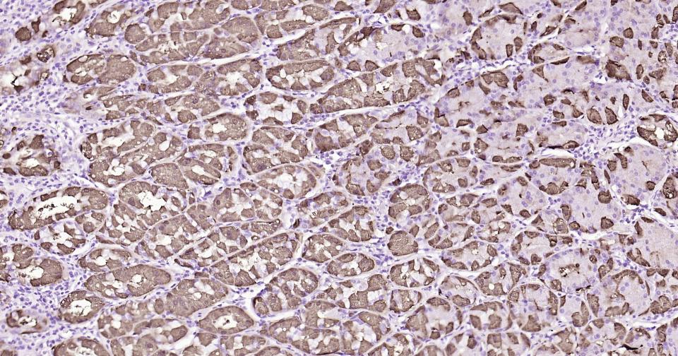Paraformaldehyde-fixed, paraffin embedded Mouse Stomach; Antigen retrieval by boiling in sodium citrate buffer (pH6.0) for 15 min; Antibody incubation with IKB alpha Monoclonal Antibody, Unconjugated(bsm-56204R) at 1:200 overnight at 4°C, followed by conjugation to the bs-0295G-HRP and DAB (C-0010) staining.
