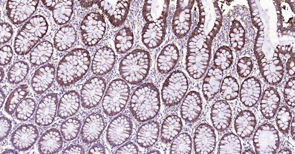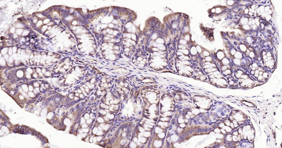 Paraformaldehyde-fixed, paraffin embedded Mouse Colon; Antigen retrieval by boiling in sodium citrate buffer (pH6.0) for 15 min; Antibody incubation with IKB alpha Monoclonal Antibody, Unconjugated(bsm-56204R) at 1:200 overnight at 4°C, followed by conjugation to the bs-0295G-HRP and DAB (C-0010) staining.