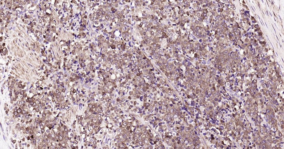 Paraformaldehyde-fixed, paraffin embedded Human Prostate Tumor; Antigen retrieval by boiling in sodium citrate buffer (pH6.0) for 15 min; Antibody incubation with IKB alpha Monoclonal Antibody, Unconjugated(bsm-56204R) at 1:200 overnight at 4°C, followed by conjugation to the bs-0295G-HRP and DAB (C-0010) staining.