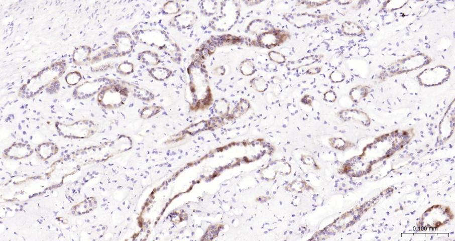 Paraformaldehyde-fixed, paraffin embedded (Human kidney); Antigen retrieval by boiling in sodium EDTA buffer (Ph9.0) for 15min; Block endogenous peroxidase by 3% hydrogen peroxide for 20 minutes; Blocking buffer (normal goat serum) at 37°C for 30min; Incubation with (IL18) Monoclonal Antibody, Unconjugated (bsm-56205R) at 1:250 overnight at 4°C, followed by operating according to SP Kit(Rabbit) (sp-0023) instructionsand DAB staining.