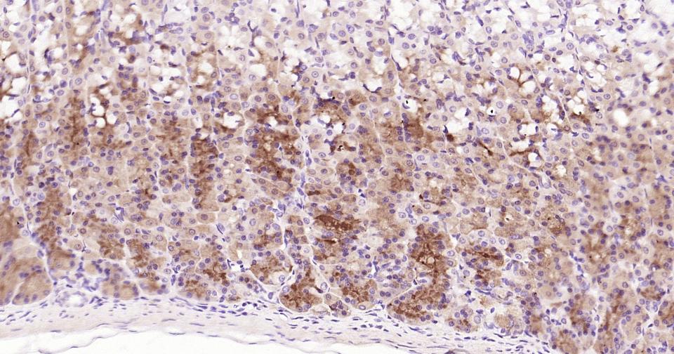 Paraformaldehyde-fixed, paraffin embedded Mouse Stomach; Antigen retrieval by boiling in sodium citrate buffer (pH6.0) for 15 min; Antibody incubation with Notch1 Monoclonal Antibody, Unconjugated(bsm-60871R) at 1:200 overnight at 4°C, followed by conjugation to the bs-0295G-HRP and DAB (C-0010) staining.