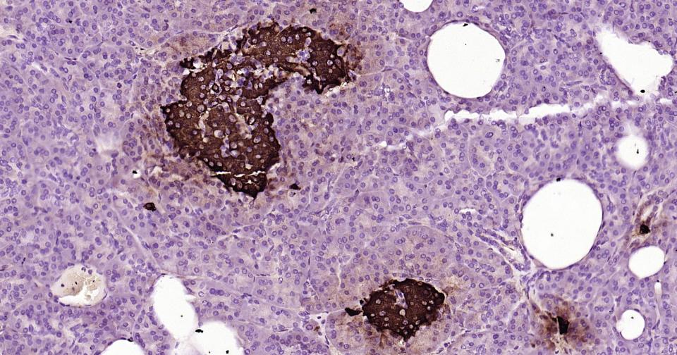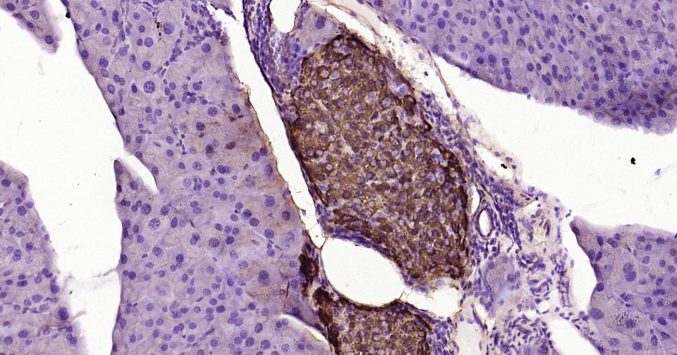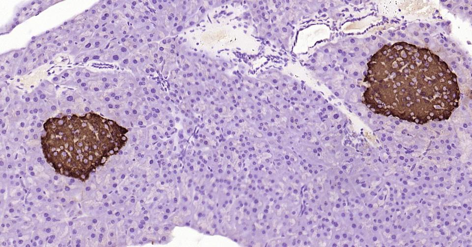 Paraformaldehyde-fixed, paraffin embedded Rat Pancreas; Antigen retrieval by boiling in sodium citrate buffer (pH6.0) for 15 min; Antibody incubation with Notch1 Monoclonal Antibody, Unconjugated(bsm-60871R) at 1:200 overnight at 4°C, followed by conjugation to the bs-0295G-HRP and DAB (C-0010) staining.