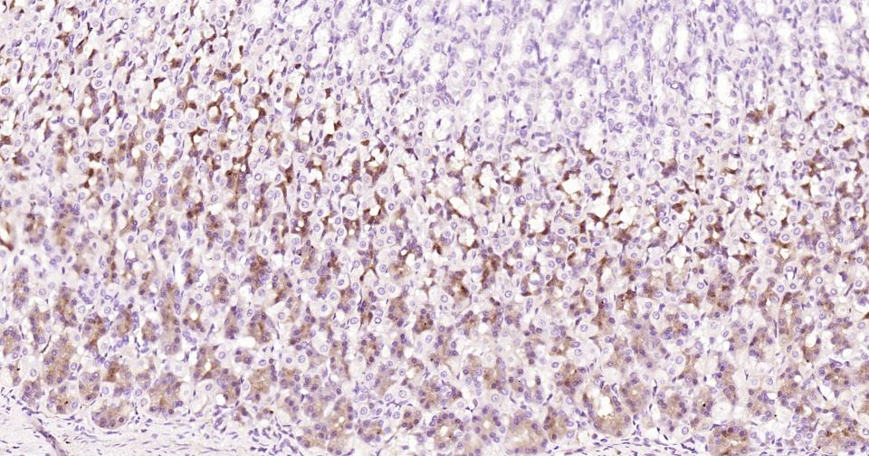 Paraformaldehyde-fixed, paraffin embedded Rat Stomach; Antigen retrieval by boiling in sodium citrate buffer (pH6.0) for 15 min; Antibody incubation with Notch1 Monoclonal Antibody, Unconjugated(bsm-60871R) at 1:200 overnight at 4°C, followed by conjugation to the bs-0295G-HRP and DAB (C-0010) staining.