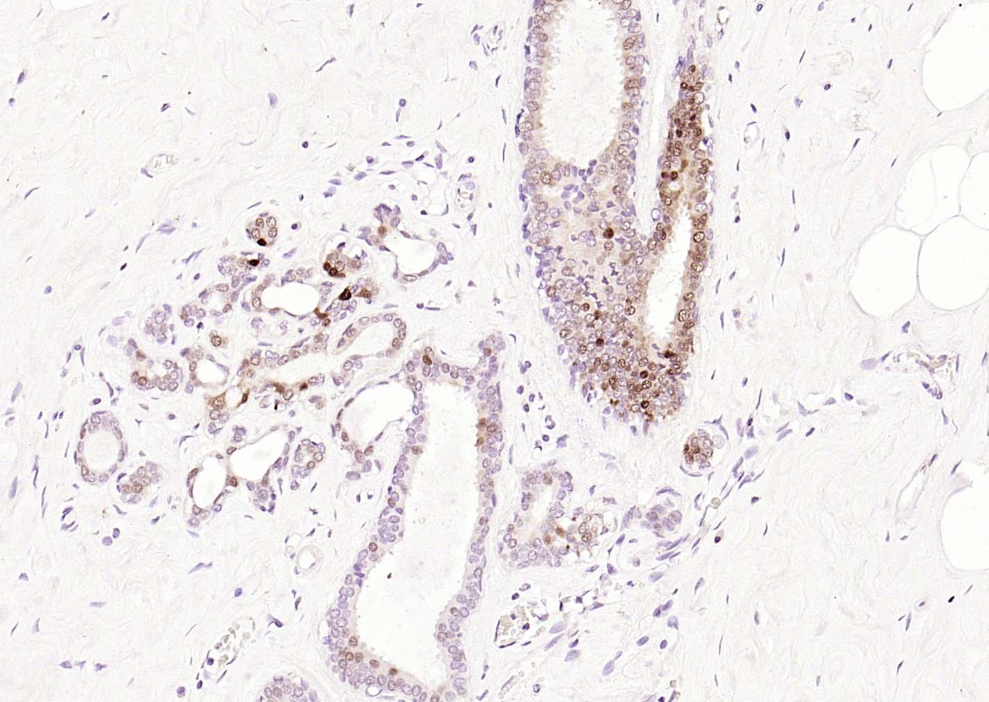 Paraformaldehyde-fixed, paraffin embedded (human breast); Antigen retrieval by boiling in EDTA buffer (pH6.0) for 15min; Block endogenous peroxidase by 3% hydrogen peroxide for 20 minutes; Blocking buffer (normal goat serum) at 37°C for 30min; Incubation with (STAT5A) Monoclonal Antibody, Unconjugated (bsm-60899R) at 1:100 overnight at 4°C, followed by operating according to SP Kit(Rabbit) (sp-0023) instructionsand DAB staining.
