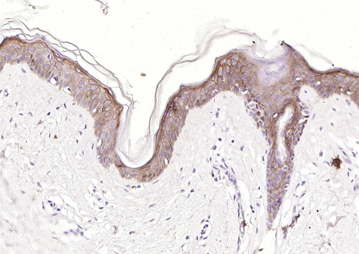 Paraformaldehyde-fixed, paraffin embedded (human Abdominal skin); Antigen retrieval by boiling in sodium citrate buffer (pH6.0) for 15min; Block endogenous peroxidase by 3% hydrogen peroxide for 20 minutes; Blocking buffer (normal goat serum) at 37°C for 30min; Incubation with (CD138) Monoclonal Antibody, Unconjugated (bsm-60902R) at 1:200 overnight at 4°C, followed by operating according to SP Kit(Rabbit) (sp-0023) instructionsand DAB staining.
