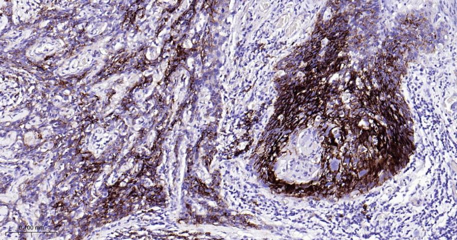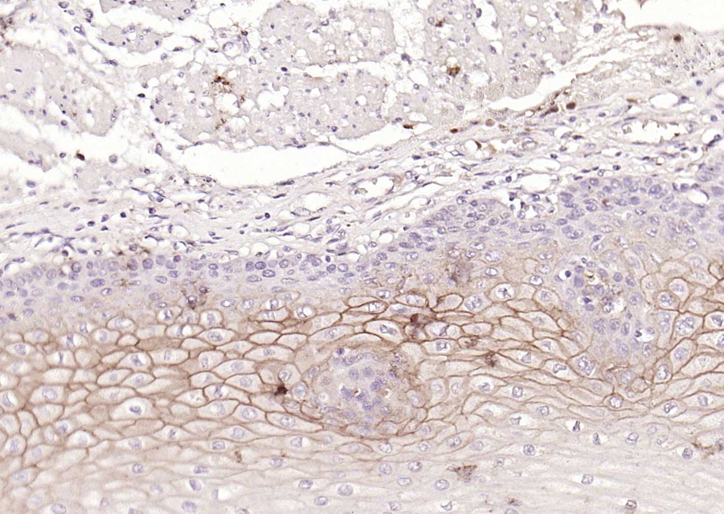 Paraformaldehyde-fixed, paraffin embedded (human esophagus); Antigen retrieval by boiling in sodium citrate buffer (pH6.0) for 15min; Block endogenous peroxidase by 3% hydrogen peroxide for 20 minutes; Blocking buffer (normal goat serum) at 37°C for 30min; Incubation with (CD138) Monoclonal Antibody, Unconjugated (bsm-60902R) at 1:200 overnight at 4°C, followed by operating according to SP Kit(Rabbit) (sp-0023) instructionsand DAB staining.