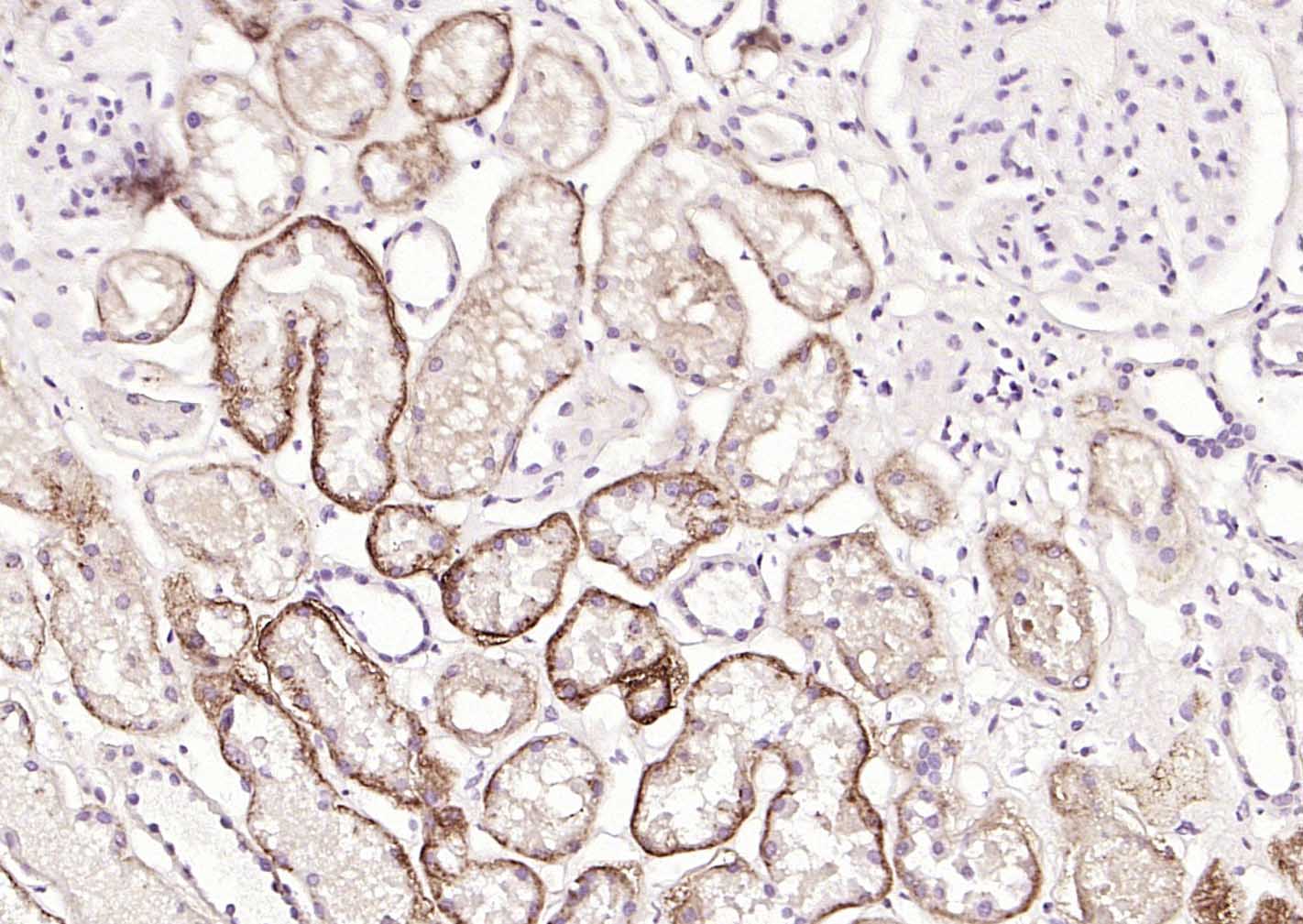 Paraformaldehyde-fixed, paraffin embedded (human kidney); Antigen retrieval by boiling in sodium citrate buffer (pH6.0) for 15min; Block endogenous peroxidase by 3% hydrogen peroxide for 20 minutes; Blocking buffer (normal goat serum) at 37°C for 30min; Incubation with (CD138) Monoclonal Antibody, Unconjugated (bsm-60902R) at 1:200 overnight at 4°C, followed by operating according to SP Kit(Rabbit) (sp-0023) instructionsand DAB staining.