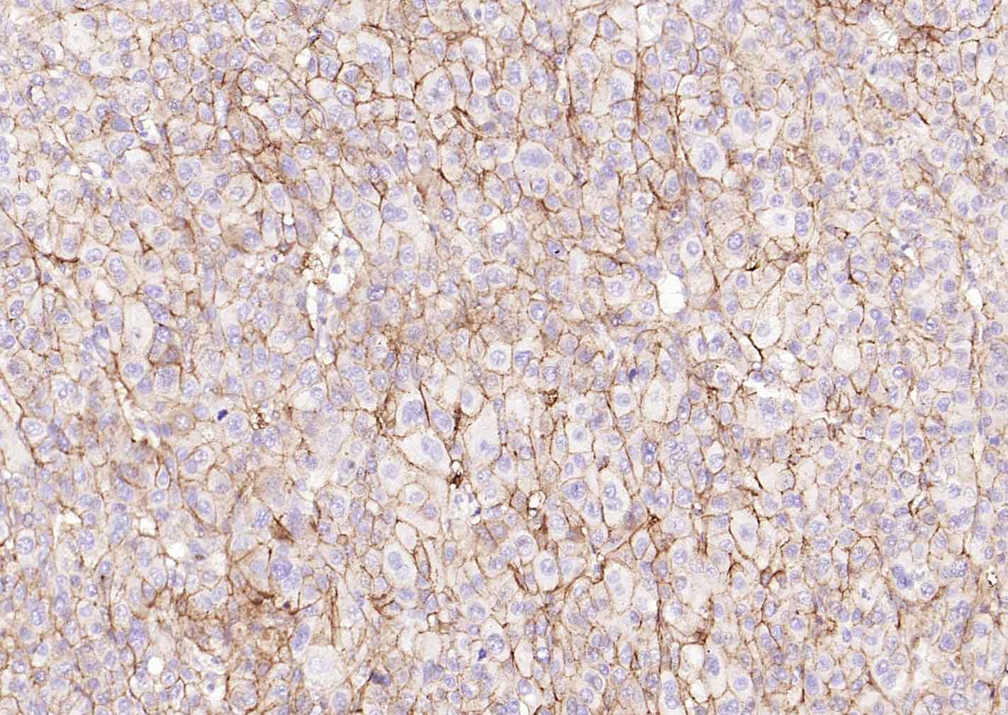 Paraformaldehyde-fixed, paraffin embedded (human liver carcinoma); Antigen retrieval by boiling in sodium citrate buffer (pH6.0) for 15min; Block endogenous peroxidase by 3% hydrogen peroxide for 20 minutes; Blocking buffer (normal goat serum) at 37°C for 30min; Incubation with (CD138) Monoclonal Antibody, Unconjugated (bsm-60902R) at 1:200 overnight at 4°C, followed by operating according to SP Kit(Rabbit) (sp-0023)instructionsand DAB staining.