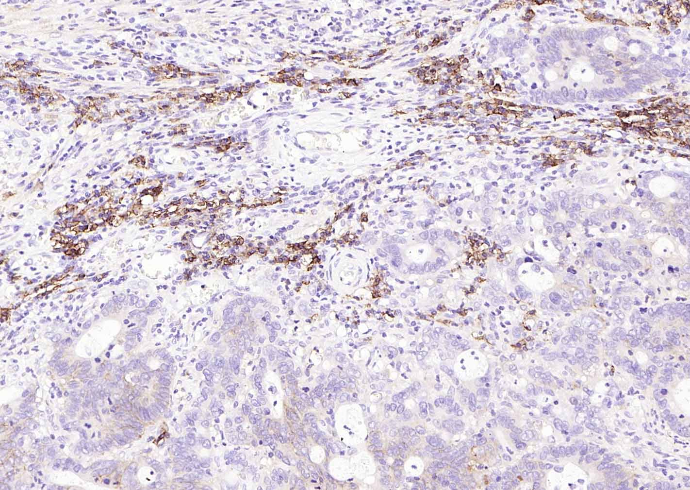 Paraformaldehyde-fixed, paraffin embedded (human colon carcinoma); Antigen retrieval by boiling in sodium citrate buffer (pH6.0) for 15min; Block endogenous peroxidase by 3% hydrogen peroxide for 20 minutes; Blocking buffer (normal goat serum) at 37°C for 30min; Incubation with (CD138) Monoclonal Antibody, Unconjugated (bsm-60902R) at 1:200 overnight at 4°C, followed by operating according to SP Kit(Rabbit) (sp-0023)instructionsand DAB staining.