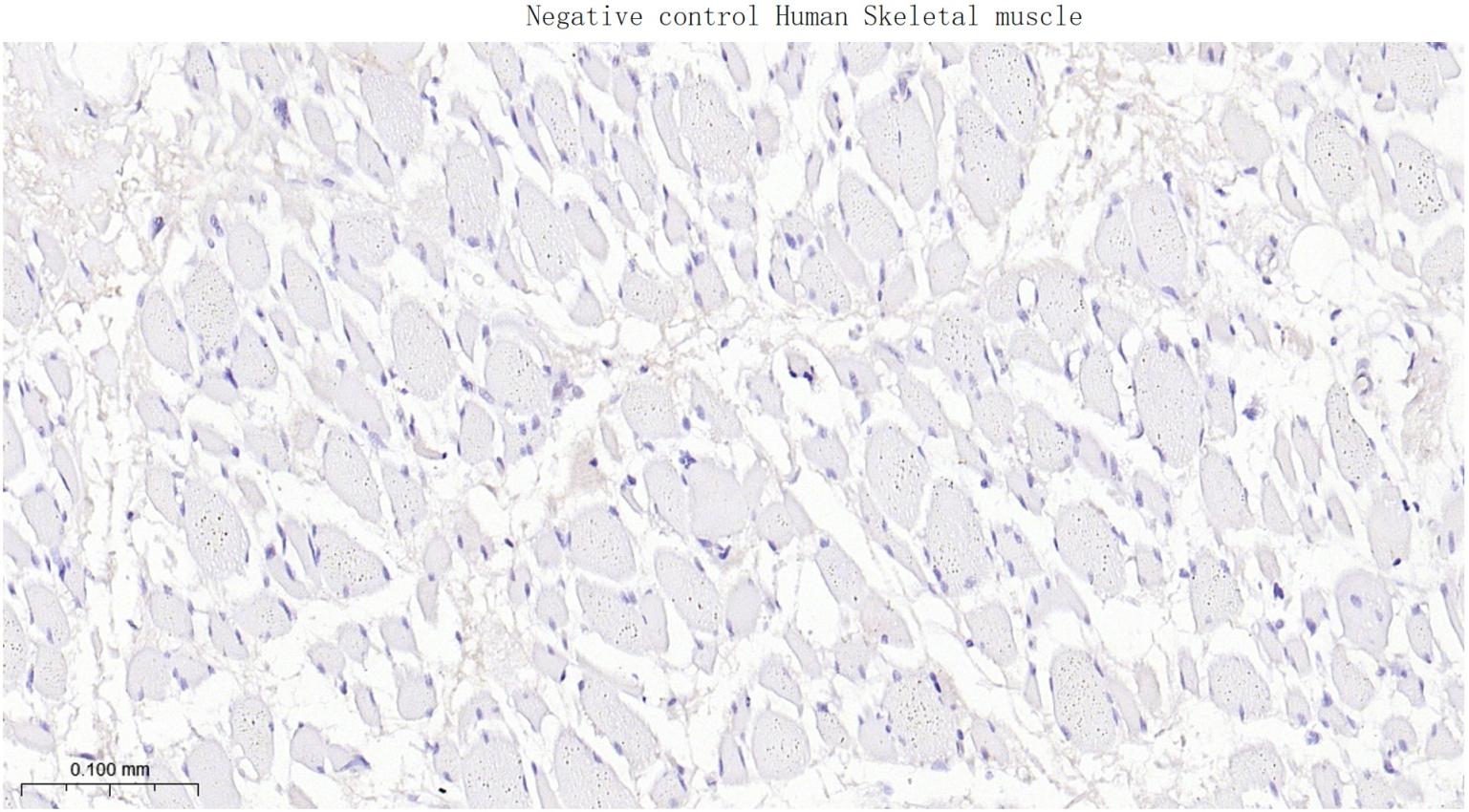 (Negative control) Paraformaldehyde-fixed, paraffin embedded Human Skeletal muscle; Antigen retrieval by boiling in sodium citrate buffer (pH6.0) for 15 min; The section was incubated with CD138 Monoclonal Antibody, Unconjugated (bsm-60902R) at 1:200 overnight at 4°C, followed by conjugation to the bs-0295G-HRP and DAB (C-0010) staining.