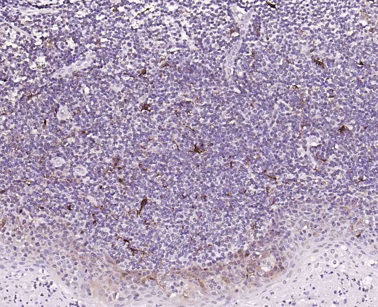 Paraformaldehyde-fixed, paraffin embedded (human tonsil); Antigen retrieval by boiling in sodium citrate buffer (pH6.0) for 15min; Block endogenous peroxidase by 3% hydrogen peroxide for 20 minutes; Blocking buffer (normal goat serum) at 37°C for 30min; Incubation with (IL18) Monoclonal Antibody, Unconjugated (bsm-54805R) at 1:200 overnight at 4°C, followed by operating according to SP Kit(Rabbit) (sp-0023) instructionsand DAB staining.