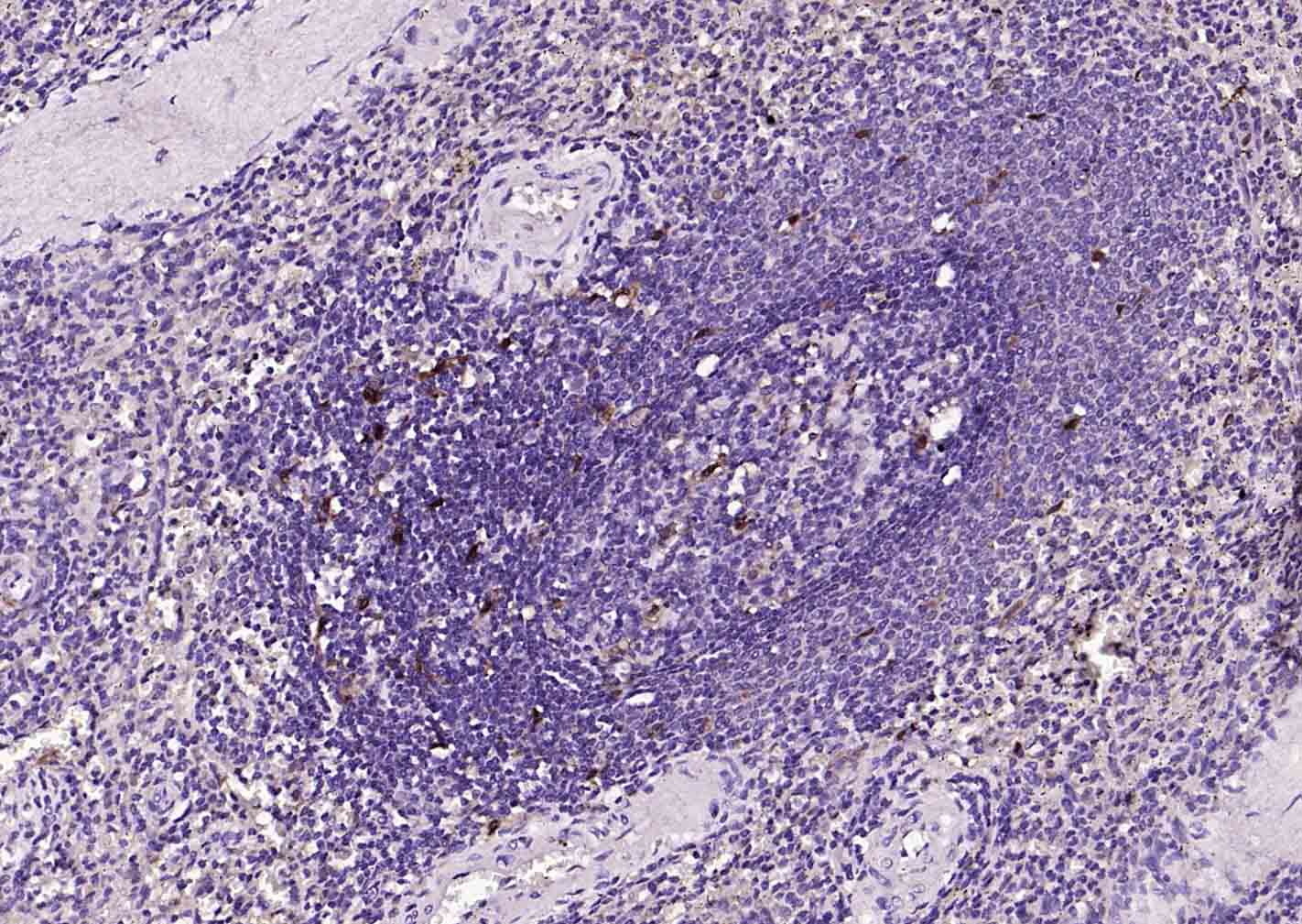 Paraformaldehyde-fixed, paraffin embedded (human spleen); Antigen retrieval by boiling in sodium citrate buffer (pH6.0) for 15min; Block endogenous peroxidase by 3% hydrogen peroxide for 20 minutes; Blocking buffer (normal goat serum) at 37°C for 30min; Incubation with (IL18 ) Monoclonal Antibody, Unconjugated (bsm-54805R) at 1:300 overnight at 4°C, followed by operating according to SP Kit(Rabbit) (sp-0023)instructionsand DAB staining.