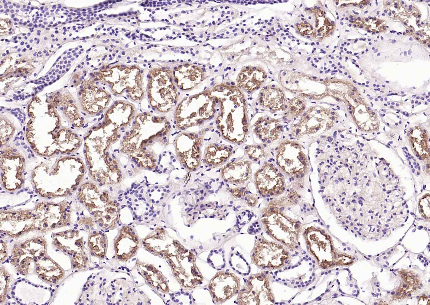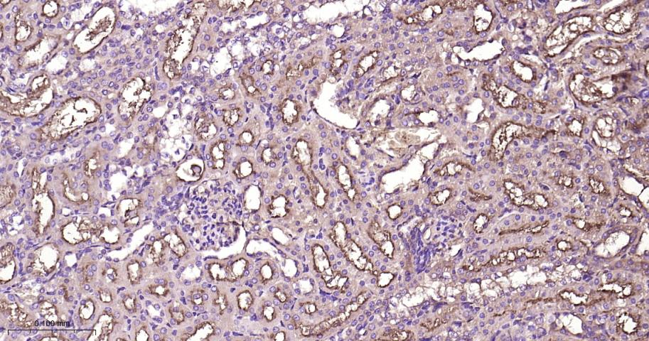 Paraformaldehyde-fixed, paraffin embedded (human kidney); Antigen retrieval by boiling in sodium citrate buffer (pH6.0) for 15min; Block endogenous peroxidase by 3% hydrogen peroxide for 20 minutes; Blocking buffer (normal goat serum) at 37°C for 30min; Incubation with (CD26/DPP4) Monoclonal Antibody, Unconjugated (bsm-60915R) at 1:100 overnight at 4°C, followed by operating according to SP Kit(Rabbit) (sp-0023) instructionsand DAB staining.