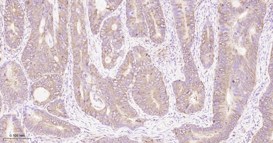 Paraformaldehyde-fixed, paraffin embedded Human Colon Cancer; Antigen retrieval by boiling in sodium citrate buffer (pH6.0) for 15 min; The section was incubated with DPP4/CD26 Monoclonal Antibody, Unconjugated (bsm-60915R) at 1:200 overnight at 4°C, followed by conjugation to the bs-0295G-HRP and DAB (C-0010) staining.