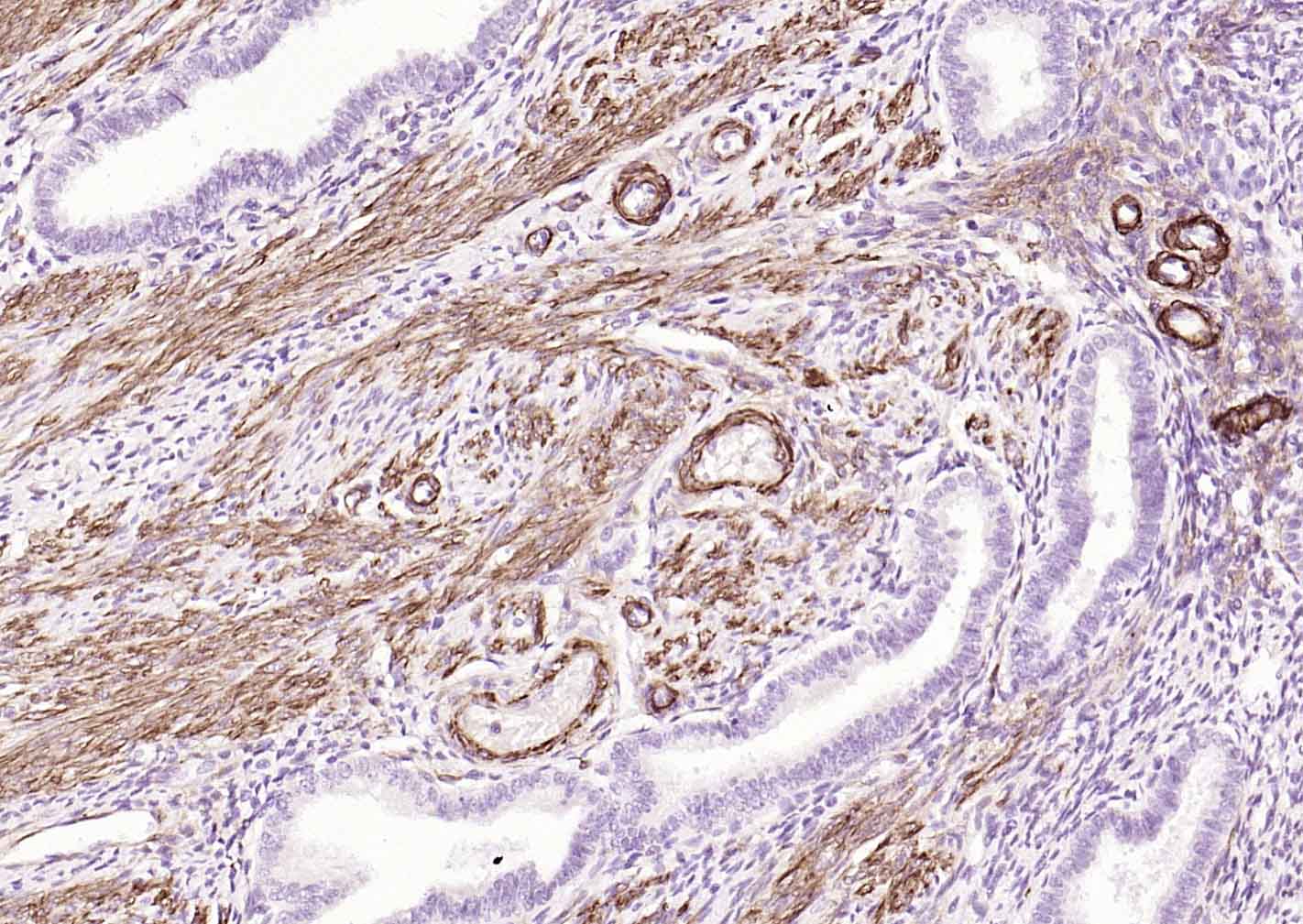 Paraformaldehyde-fixed, paraffin embedded (human uterus); Antigen retrieval by boiling in sodium citrate buffer (pH6.0) for 15min; Block endogenous peroxidase by 3% hydrogen peroxide for 20 minutes; Blocking buffer (normal goat serum) at 37°C for 30min; Incubation with (Caldesmon/CDM) Monoclonal Antibody, Unconjugated (bsm-60918R) at 1:200 overnight at 4°C, followed by operating according to SP Kit(Rabbit) (sp-0023) instructionsand DAB staining.