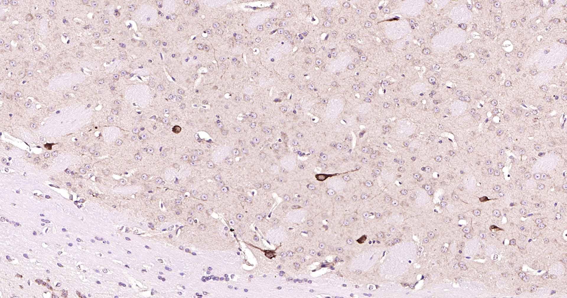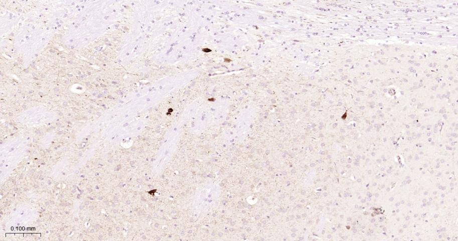 Paraformaldehyde-fixed, paraffin embedded Rat Cerebrum; Antigen retrieval by boiling in sodium citrate buffer (pH6.0) for 15 min; Antibody incubation with ChAT Monoclonal Antibody, Unconjugated(bsm-54807R) at 1:200 overnight at 4°C, followed by conjugation to the SP Kit (Rabbit, SP-0023) and DAB (C-0010) staining.