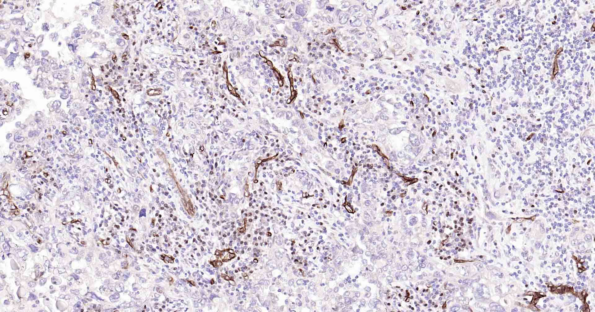 Paraformaldehyde-fixed, paraffin embedded Human Lung Cancer; Antigen retrieval by boiling in sodium citrate buffer (pH6.0) for 15 min; Antibody incubation with AQP1 Monoclonal Antibody, Unconjugated(bsm-52909R) at 1:200 overnight at 4°C, followed by conjugation to the SP Kit(Rabbit, SP-0023) and DAB (C-0010) staining.