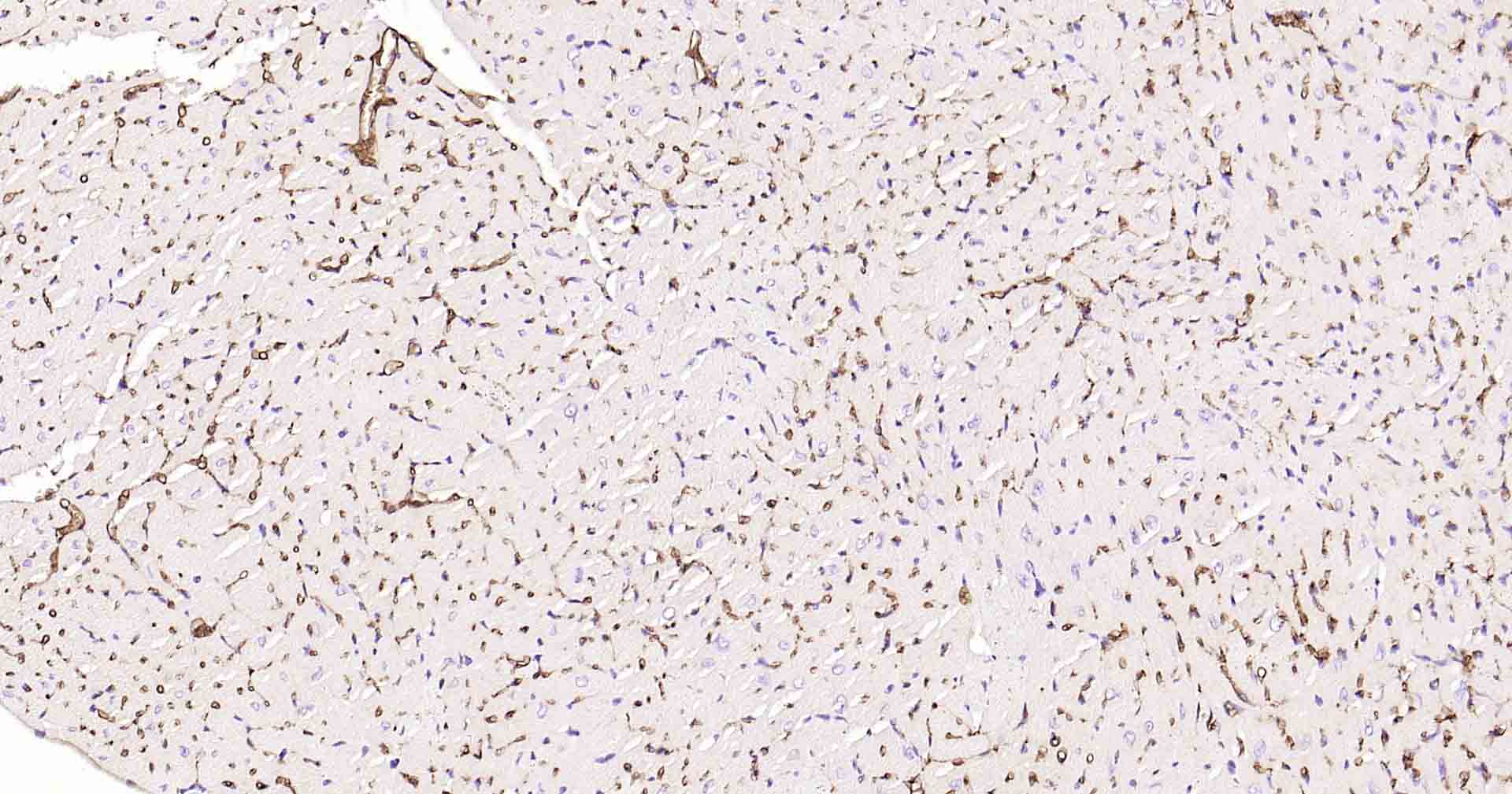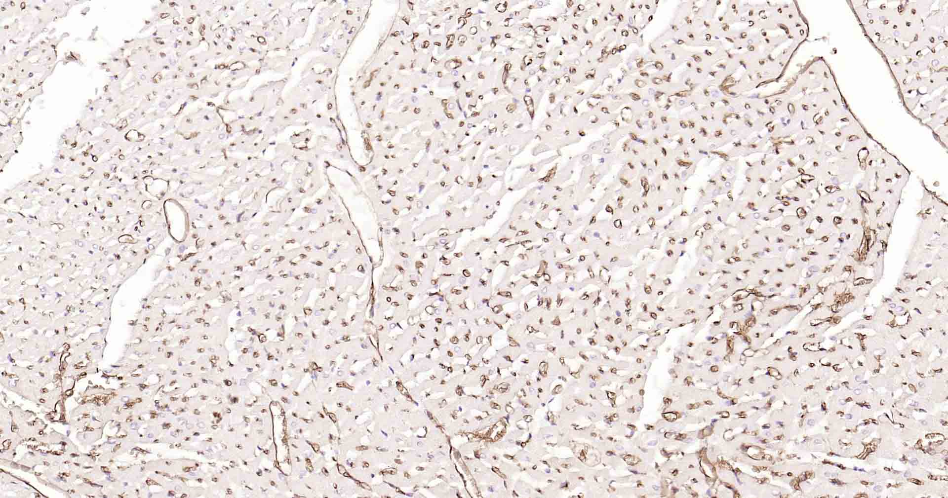 Paraformaldehyde-fixed, paraffin embedded Mouse Heart; Antigen retrieval by boiling in sodium citrate buffer (pH6.0) for 15 min; Antibody incubation with AQP1 Monoclonal Antibody, Unconjugated(bsm-52909R) at 1:200 overnight at 4°C, followed by conjugation to the SP Kit(Rabbit, SP-0023) and DAB (C-0010) staining.