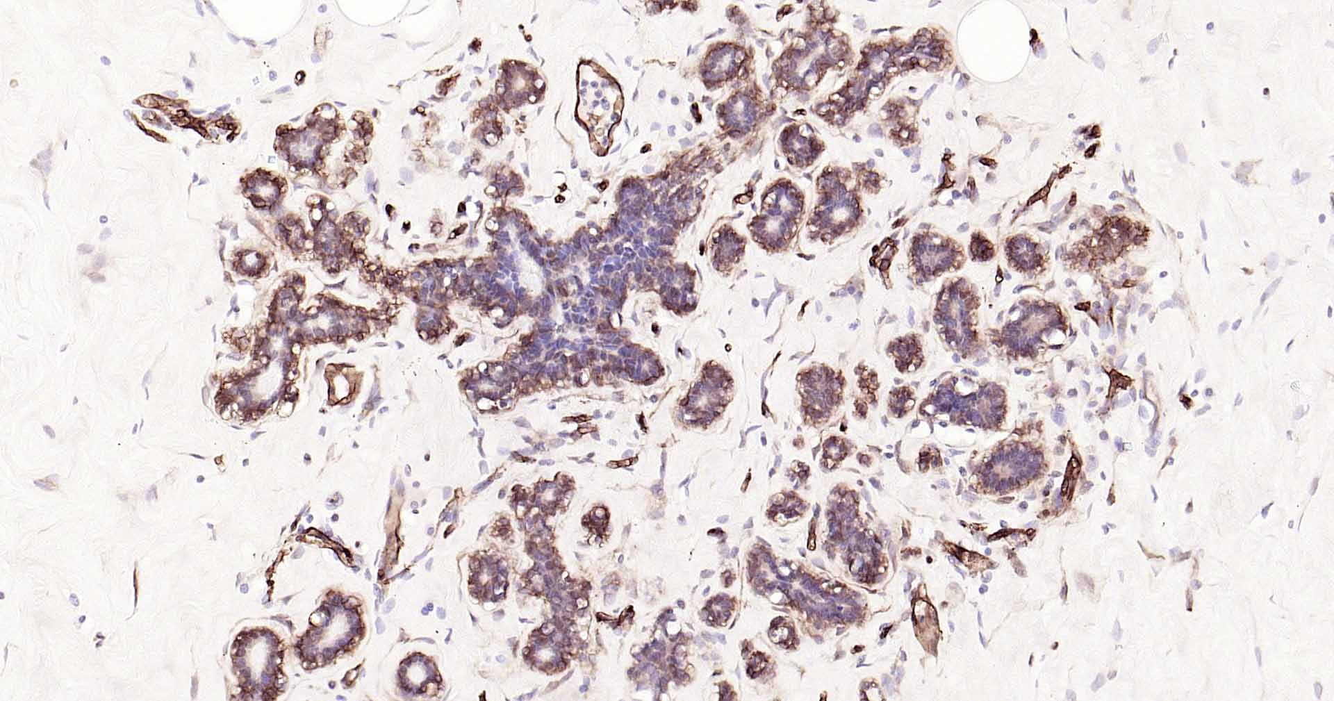 Paraformaldehyde-fixed, paraffin embedded Human Breast ; Antigen retrieval by boiling in sodium citrate buffer (pH6.0) for 15 min; Antibody incubation with AQP1 Monoclonal Antibody, Unconjugated(bsm-52909R) at 1:200 overnight at 4°C, followed by conjugation to the SP Kit(Rabbit, SP-0023) and DAB (C-0010) staining.