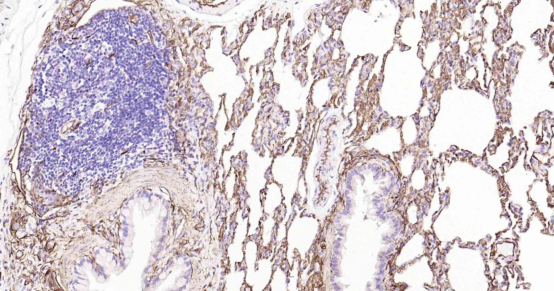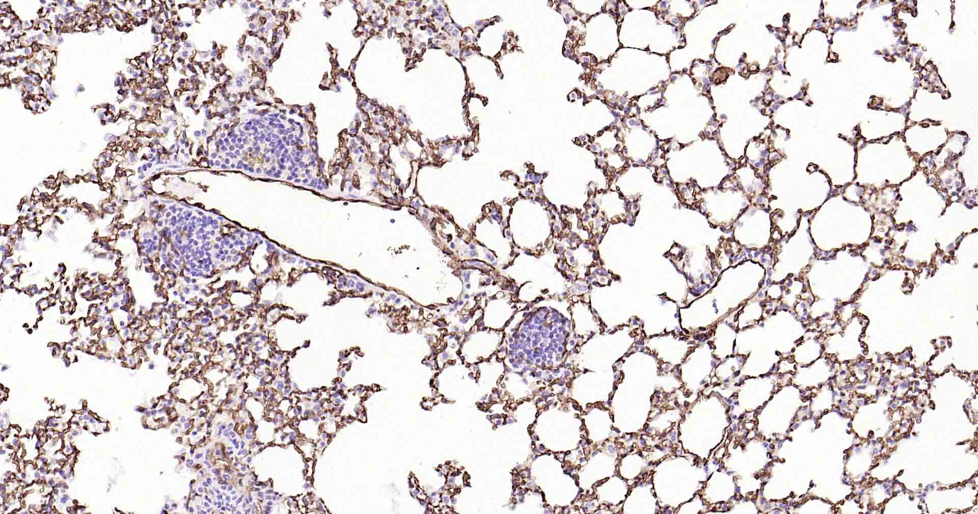 Paraformaldehyde-fixed, paraffin embedded Rat Lung; Antigen retrieval by boiling in sodium citrate buffer (pH6.0) for 15 min; Antibody incubation with AQP1 Monoclonal Antibody, Unconjugated(bsm-52909R) at 1:200 overnight at 4°C, followed by conjugation to the SP Kit(Rabbit, SP-0023) and DAB (C-0010) staining.
