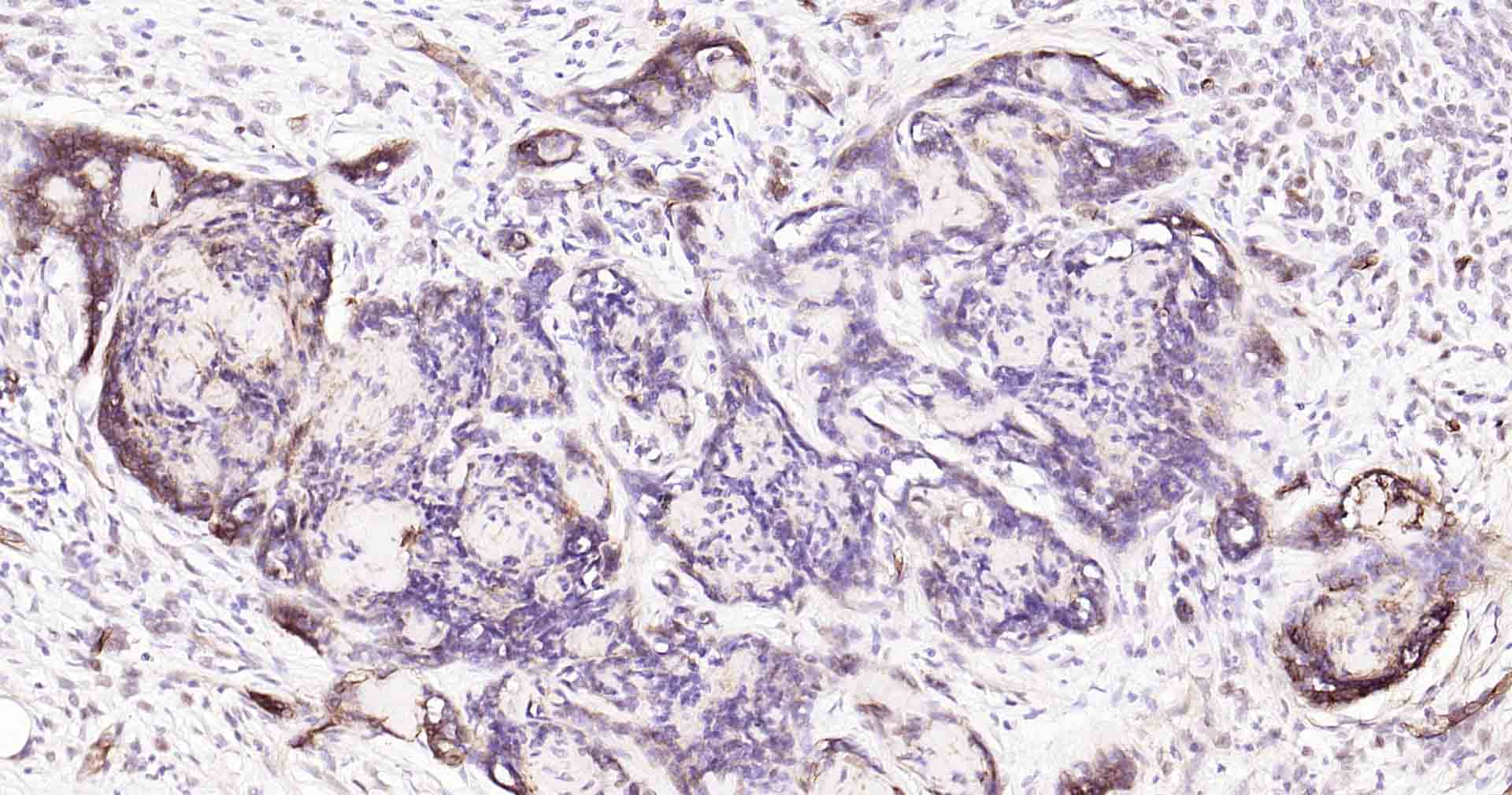 Paraformaldehyde-fixed, paraffin embedded Human Pancreatic Cancer; Antigen retrieval by boiling in sodium citrate buffer (pH6.0) for 15 min; Antibody incubation with AQP1 Monoclonal Antibody, Unconjugated(bsm-52909R) at 1:200 overnight at 4°C, followed by conjugation to the SP Kit(Rabbit, SP-0023) and DAB (C-0010) staining.