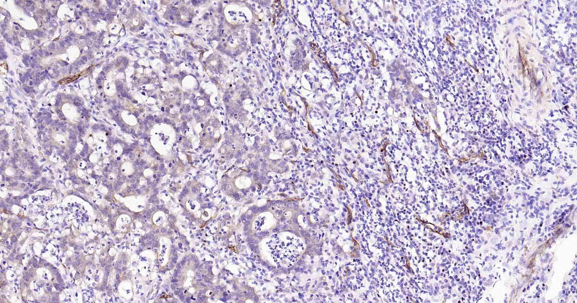 Paraformaldehyde-fixed, paraffin embedded Human Colon Cancer; Antigen retrieval by boiling in sodium citrate buffer (pH6.0) for 15 min; Antibody incubation with AQP1 Monoclonal Antibody, Unconjugated(bsm-52909R) at 1:200 overnight at 4°C, followed by conjugation to the SP Kit(Rabbit, SP-0023) and DAB (C-0010) staining.