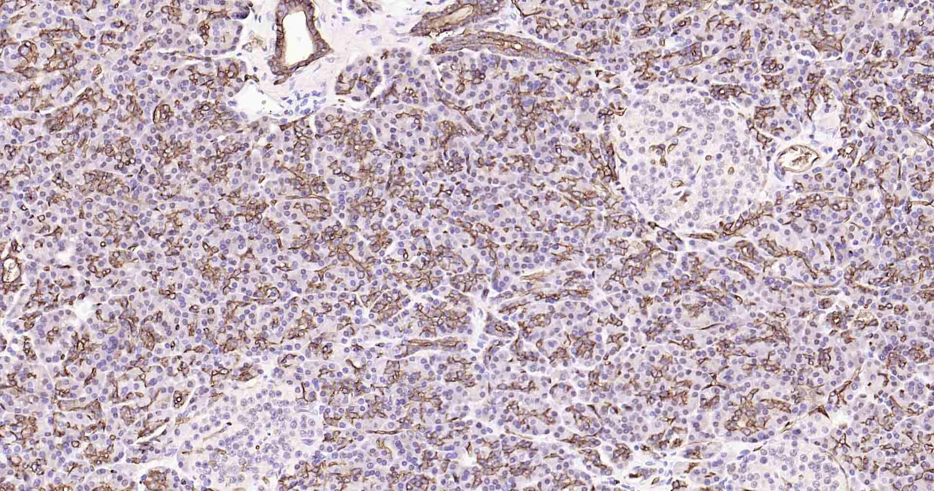 Paraformaldehyde-fixed, paraffin embedded Human Pancreas; Antigen retrieval by boiling in sodium citrate buffer (pH6.0) for 15 min; Antibody incubation with AQP1 Monoclonal Antibody, Unconjugated(bsm-52909R) at 1:200 overnight at 4°C, followed by conjugation to the SP Kit(Rabbit, SP-0023) and DAB (C-0010) staining.