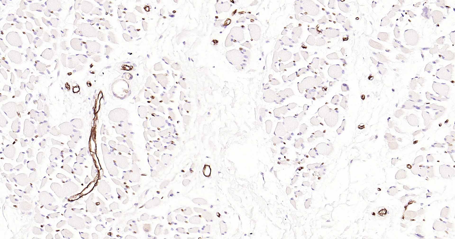 Paraformaldehyde-fixed, paraffin embedded Human Skeletal muscle; Antigen retrieval by boiling in sodium citrate buffer (pH6.0) for 15 min; Antibody incubation with AQP1 Monoclonal Antibody, Unconjugated(bsm-52909R) at 1:200 overnight at 4°C, followed by conjugation to the SP Kit(Rabbit, SP-0023) and DAB (C-0010) staining.