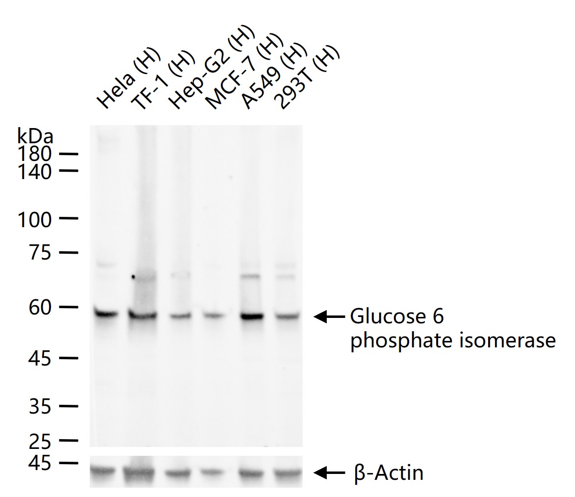 25 ug total protein per lane of various lysates (see on figure) probed with Glucose 6 phosphate isomerase monoclonal antibody, unconjugated (bsm-61012R) at 1:1000 dilution and 4°C overnight incubation. Followed by conjugated secondary antibody incubation at r.t. for 60 min.