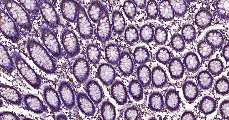 Paraformaldehyde-fixed, paraffin embedded Human Colon ; Antigen retrieval by boiling in sodium citrate buffer (pH6.0) for 15 min; Antibody incubation with Glucose 6 phosphate isomerase Monoclonal Antibody, Unconjugated(bsm-61012R) at 1:250 overnight at 4°C, followed by conjugation to the SP Kit (Rabbit, SP-0023) and DAB (C-0010) staining.