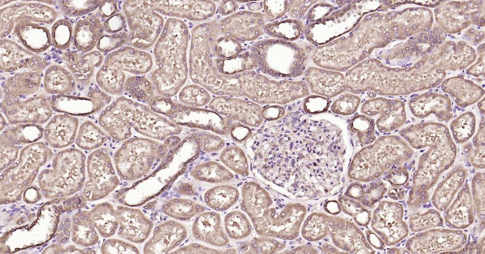 Paraformaldehyde-fixed, paraffin embedded Human Kidney; Antigen retrieval by boiling in sodium citrate buffer (pH6.0) for 15 min; Antibody incubation with Glucose 6 phosphate isomerase Monoclonal Antibody, Unconjugated(bsm-61012R) at 1:250 overnight at 4°C, followed by conjugation to the SP Kit (Rabbit, SP-0023) and DAB (C-0010) staining.