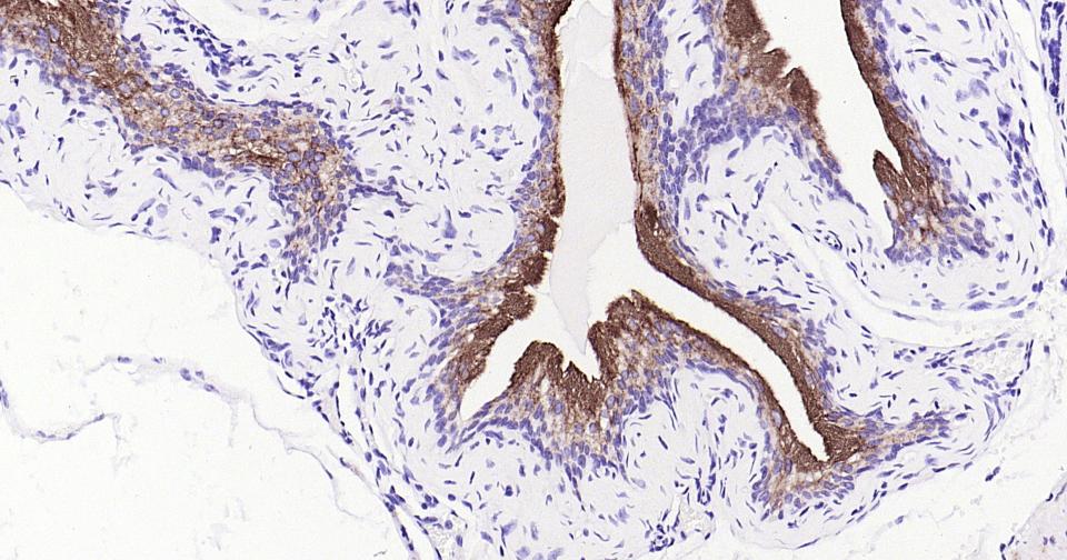 Paraformaldehyde-fixed, paraffin embedded Mouse Bladder; Antigen retrieval by boiling in sodium citrate buffer (pH6.0) for 15 min; Antibody incubation with UPK3A Monoclonal Antibody, Unconjugated(bsm-61004R) at 1:500 overnight at 4°C, followed by conjugation to the SP Kit (Rabbit, SP-0023) and DAB (C-0010) staining.