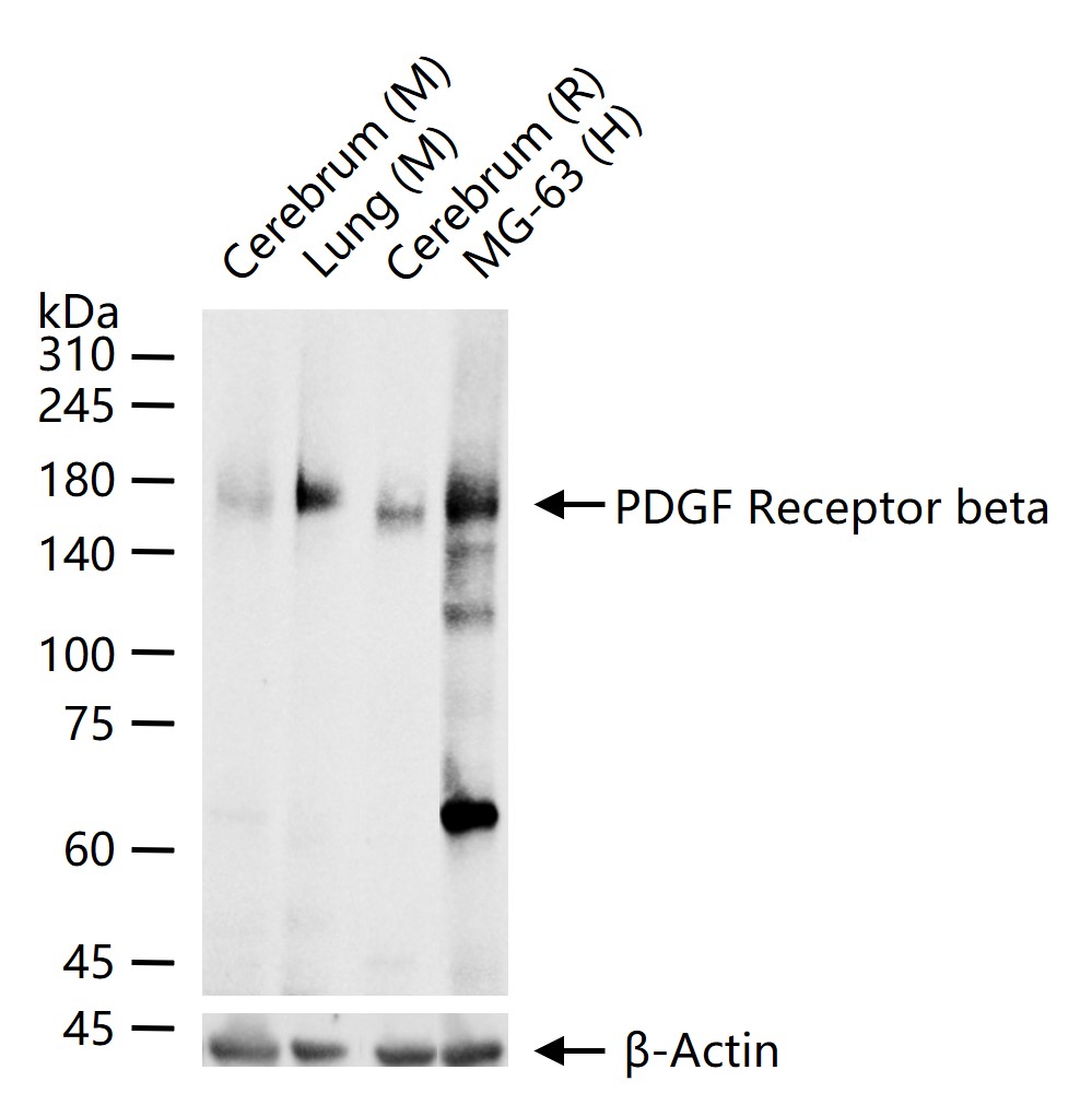 25 ug total protein per lane of various lysates (see on figure) probed with PDGF Receptor beta monoclonal antibody, unconjugated (bsm-61037R) at 1:1000 dilution and 4°C overnight incubation. Followed by conjugated secondary antibody incubation at r.t. for 60 min.