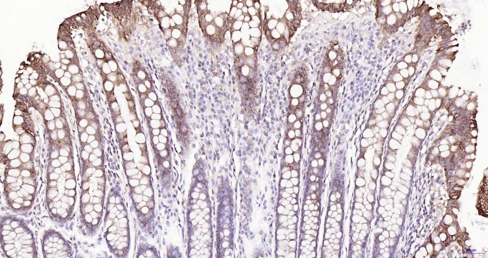 Paraformaldehyde-fixed, paraffin embedded Human Colon; Antigen retrieval by boiling in sodium citrate buffer (pH6.0) for 15 min; Antibody incubation with Frizzled 8 Monoclonal Antibody, Unconjugated(bsm-61049R) at 1:200 overnight at 4°C, followed by conjugation to the SP Kit(Rabbit, SP-0023) and DAB (C-0010) staining.
