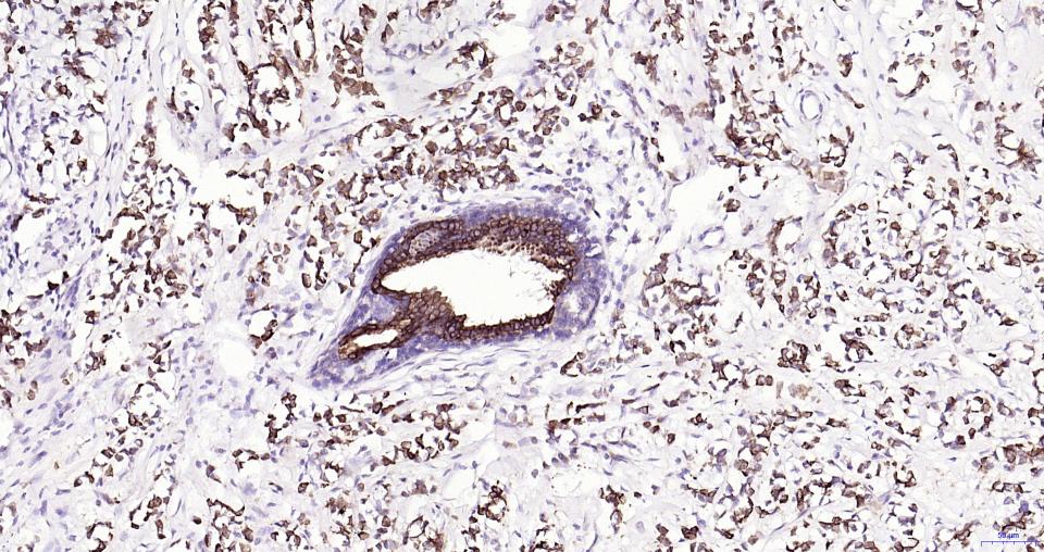 Paraformaldehyde-fixed, paraffin embedded Human Breast Cancer; Antigen retrieval by boiling in sodium citrate buffer (pH6.0) for 15 min; Antibody incubation with Frizzled 8 Monoclonal Antibody, Unconjugated(bsm-61049R) at 1:200 overnight at 4°C, followed by conjugation to the SP Kit(Rabbit, SP-0023) and DAB (C-0010) staining.