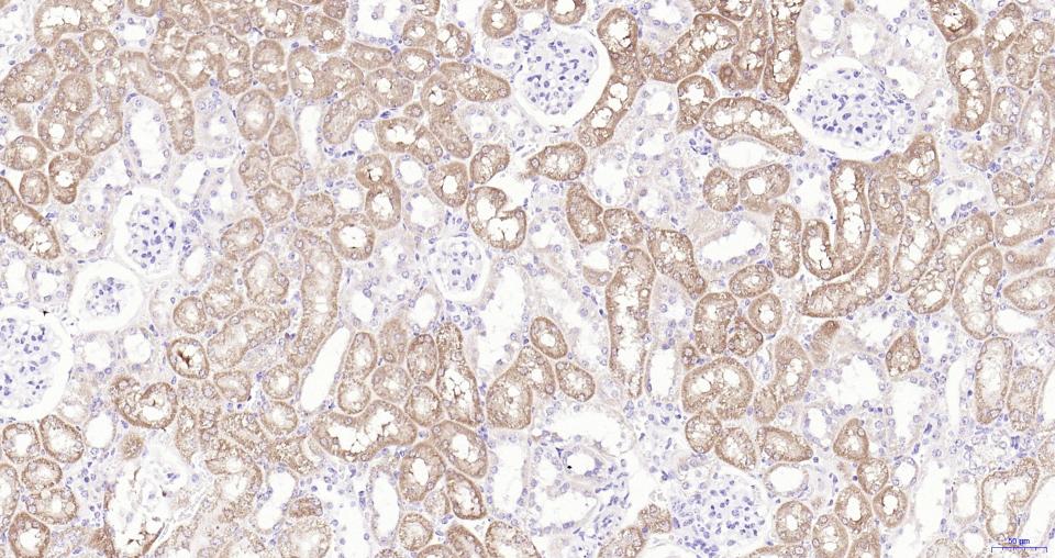 Paraformaldehyde-fixed, paraffin embedded Mouse Kidney; Antigen retrieval by boiling in sodium citrate buffer (pH6.0) for 15 min; Antibody incubation with Frizzled 8 Monoclonal Antibody, Unconjugated(bsm-61049R) at 1:200 overnight at 4°C, followed by conjugation to the SP Kit(Rabbit, SP-0023) and DAB (C-0010) staining.