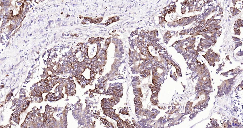 Paraformaldehyde-fixed, paraffin embedded Human Colon Cancer; Antigen retrieval by boiling in sodium citrate buffer (pH6.0) for 15 min; Antibody incubation with Frizzled 8 Monoclonal Antibody, Unconjugated(bsm-61049R) at 1:200 overnight at 4°C, followed by conjugation to the SP Kit(Rabbit, SP-0023) and DAB (C-0010) staining.