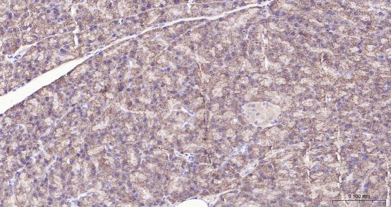 Paraformaldehyde-fixed, paraffin embedded Rat pancreas; Antigen retrieval by boiling in sodium citrate buffer (pH6.0) for 15 min; Antibody incubation with Frizzled 8 Monoclonal Antibody, Unconjugated(bsm-61049R) at 1:200 overnight at 4°C, followed by conjugation to the SP Kit(Rabbit, SP-0023) and DAB (C-0010) staining.