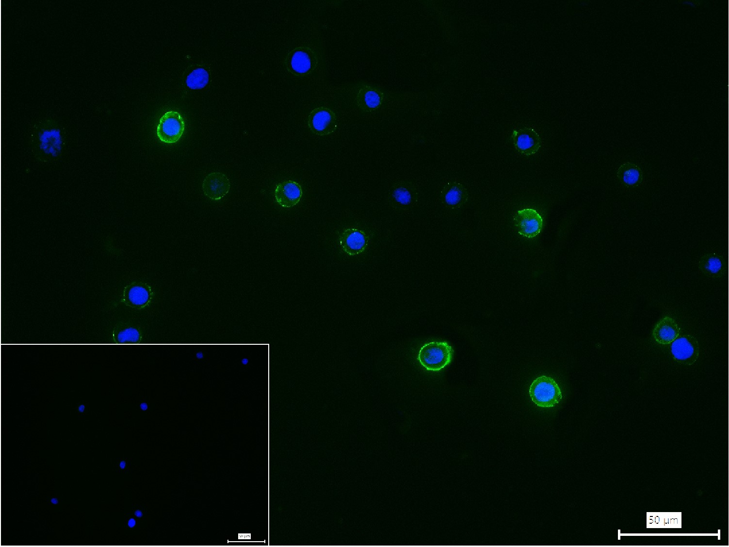 4% Paraformaldehyde-fixed Raji (H) cell; Antibody incubation with (ATK/BTK) monoclonal Antibody, unconjugated (bsm-61051R) 1:100, 90 min at 37°C; followed by conjugated Goat Anti-Rabbit IgG antibody (green, bs-40295G-FITC) at 37°C for 90 min, DAPI (blue, C02-04002) was used to stain the cell nuclei. PBS instead of the primary antibody was used as the blank control.
