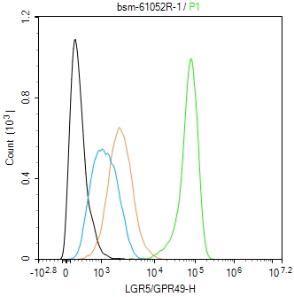 The HepG2 (H) cells were fixed with 4% PFA (10 min at r.t.) and then permeabilized with 90% ice-cold methanol for 20 min at -20℃,the cells then were incubated in 5%BSA to block non-specific protein-protein interactions (30 min at r.t.).Primary Antibody (green): Rabbit Anti-LGR5/GPR49 antibody (bsm-61052R): 1 μg/10^6 cells; Secondary Antibody (white blue): Goat anti-Rabbit IgG-FITC (bs-60295G-FITC): 1 μg/test. Isotype Control (orange): Rabbit IgG (bs-0295P). Blank control (black): PBS. Acquisition of 20,000 events was performed.
