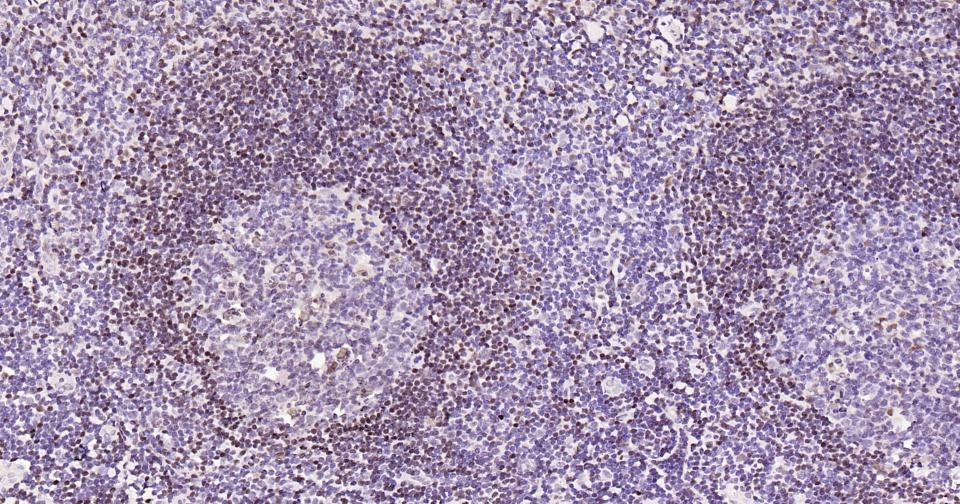 Paraformaldehyde-fixed, paraffin embedded Human Tonsil; Antigen retrieval by boiling in sodium citrate buffer (pH6.0) for 15 min; Antibody incubation with 5 Lipoxygenase  Monoclonal Antibody, Unconjugated(bsm-61061R) at 1:200 overnight at 4°C, followed by conjugation to the SP Kit (Rabbit, SP-0023) and DAB (C-0010) staining.