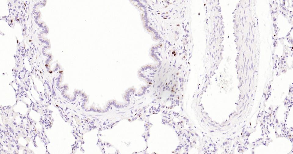 Paraformaldehyde-fixed, paraffin embedded Rat Lung; Antigen retrieval by boiling in sodium citrate buffer (pH6.0) for 15 min; Antibody incubation with 5 Lipoxygenase  Monoclonal Antibody, Unconjugated(bsm-61061R) at 1:200 overnight at 4°C, followed by conjugation to the SP Kit (Rabbit, SP-0023) and DAB (C-0010) staining.