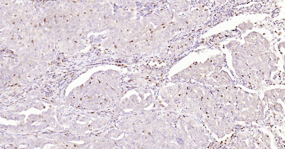 Paraformaldehyde-fixed, paraffin embedded Human Lung Cancer; Antigen retrieval by boiling in sodium citrate buffer (pH6.0) for 15 min; Antibody incubation with 5 Lipoxygenase  Monoclonal Antibody, Unconjugated(bsm-61061R) at 1:200 overnight at 4°C, followed by conjugation to the SP Kit (Rabbit, SP-0023) and DAB (C-0010) staining.