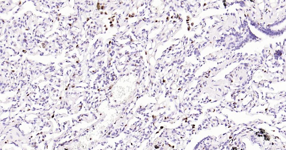 Paraformaldehyde-fixed, paraffin embedded Human Lung; Antigen retrieval by boiling in sodium citrate buffer (pH6.0) for 15 min; Antibody incubation with 5 Lipoxygenase  Monoclonal Antibody, Unconjugated(bsm-61061R) at 1:200 overnight at 4°C, followed by conjugation to the SP Kit (Rabbit, SP-0023) and DAB (C-0010) staining.