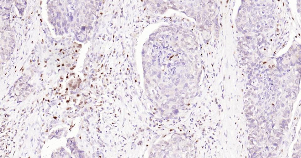 Paraformaldehyde-fixed, paraffin embedded Human Esophageal Cancer; Antigen retrieval by boiling in sodium citrate buffer (pH6.0) for 15 min; Antibody incubation with 5 Lipoxygenase  Monoclonal Antibody, Unconjugated(bsm-61061R) at 1:200 overnight at 4°C, followed by conjugation to the SP Kit (Rabbit, SP-0023) and DAB (C-0010) staining.