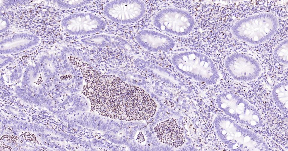 Paraformaldehyde-fixed, paraffin embedded Human Colon Cancer; Antigen retrieval by boiling in sodium citrate buffer (pH6.0) for 15 min; Antibody incubation with 5 Lipoxygenase  Monoclonal Antibody, Unconjugated(bsm-61061R) at 1:200 overnight at 4°C, followed by conjugation to the SP Kit (Rabbit, SP-0023) and DAB (C-0010) staining.